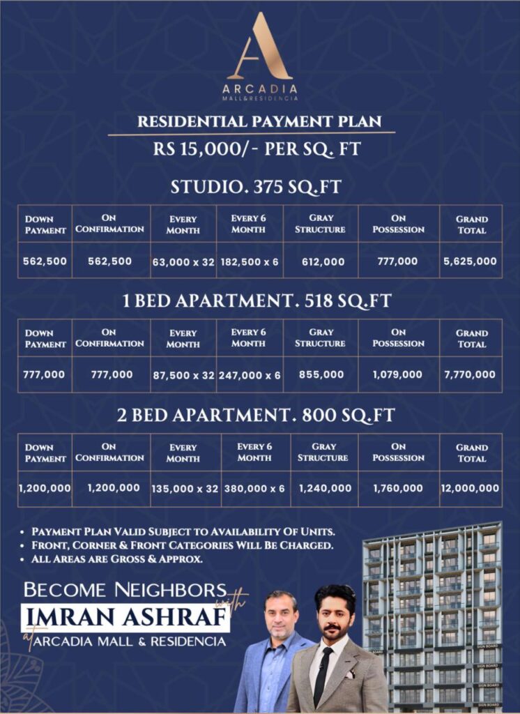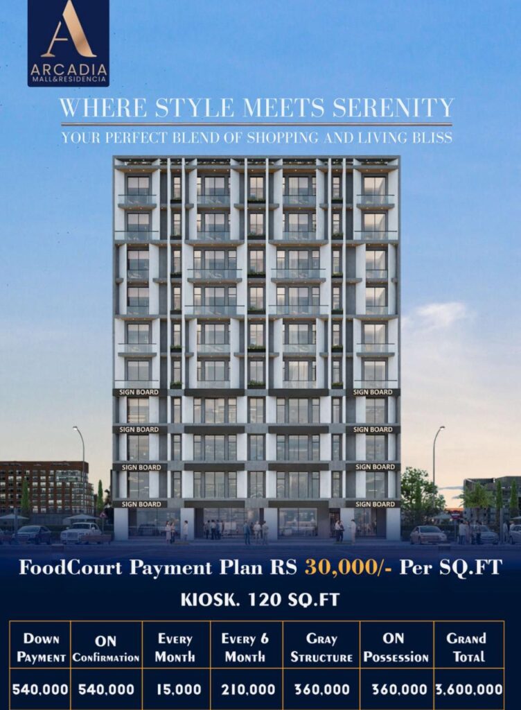 Whether you are searching for Arcadia Mall & Residencia flats for sale, looking for rental income opportunities, or planning a long-term commercial investment, this project offers a balanced mix of lifestyle, location, and returns.